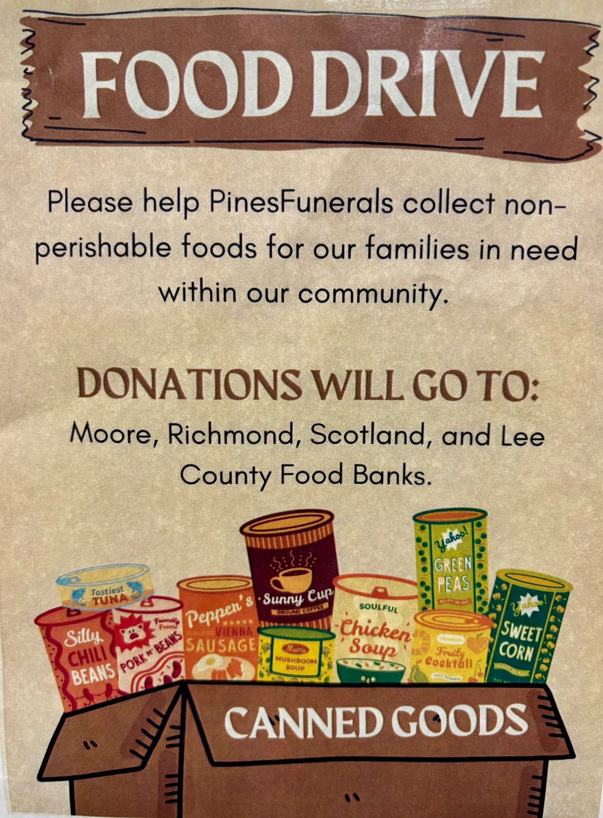 We're partnering with PinesFuneral to collect non-perishable food items to help families in need within our community. Donations will go to food banks in Moore, Richmond, Scotland and Lee Counties.